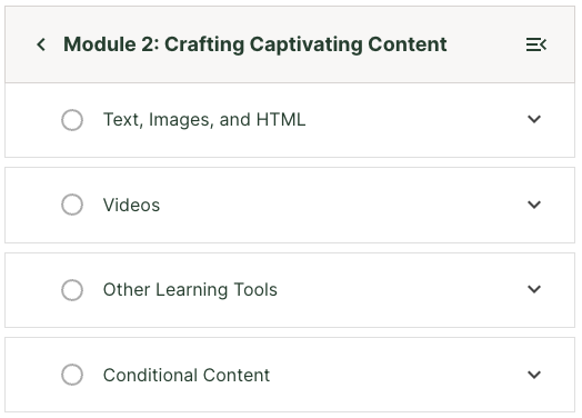 The learner can easily collapse the sidebar navigation at any time to view the course content in a full page format by clicking the collapse button in the upper corner of the sidebar.