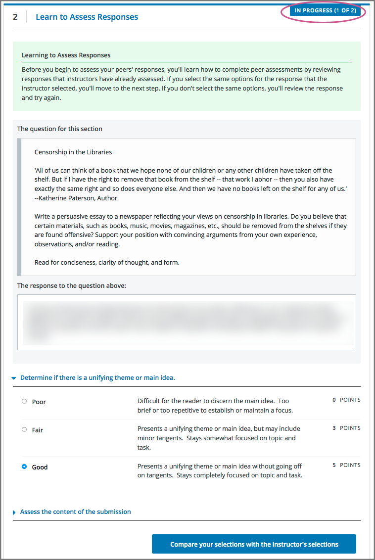 In a learner training assessment, the Learn to Assess Responses step opens immediately after a learner submits a response. The learner sees one of the sample responses that you created, along with the rubric. The scores that you gave the response do not appear. The learner also sees the number of sample responses that he or she will assess.