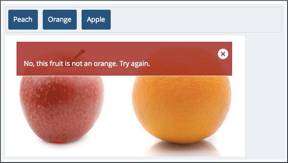 The following image shows the error feedback message that learners see when they match a draggable item with an incorrect target zone. Each draggable item has its own error feedback message.