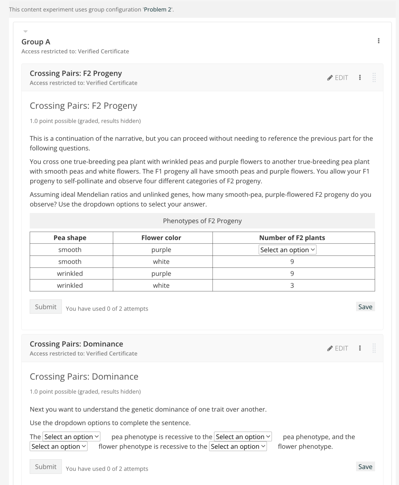 Keep the overall structure and number of problems nearly identical per content group in one unit. Manipulate easy-to-change variables like a number in a calculation. For example, in biology, these variables include DNA sequence, amino acids, tables of data, etc. The following screenshots include group A, B, and C versions of the first two related genetics questions for one unit of an exam.