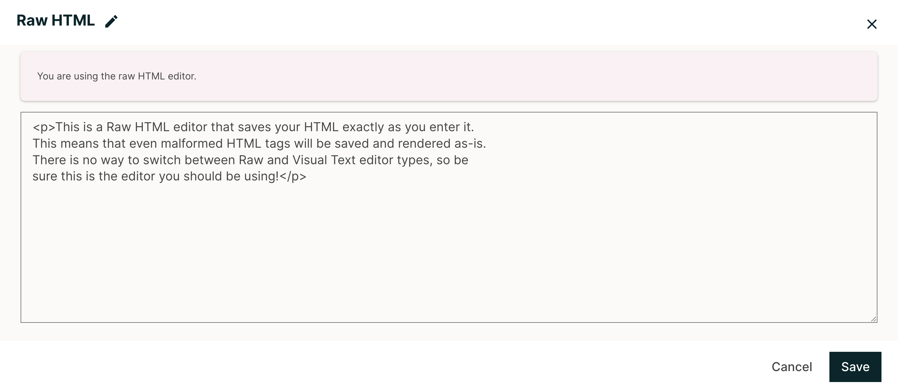 When you use this editor, you must supply valid HTML. The raw HTML editor does not validate your HTML code. If you use this editor, you should thoroughly test the HTML content in your course.