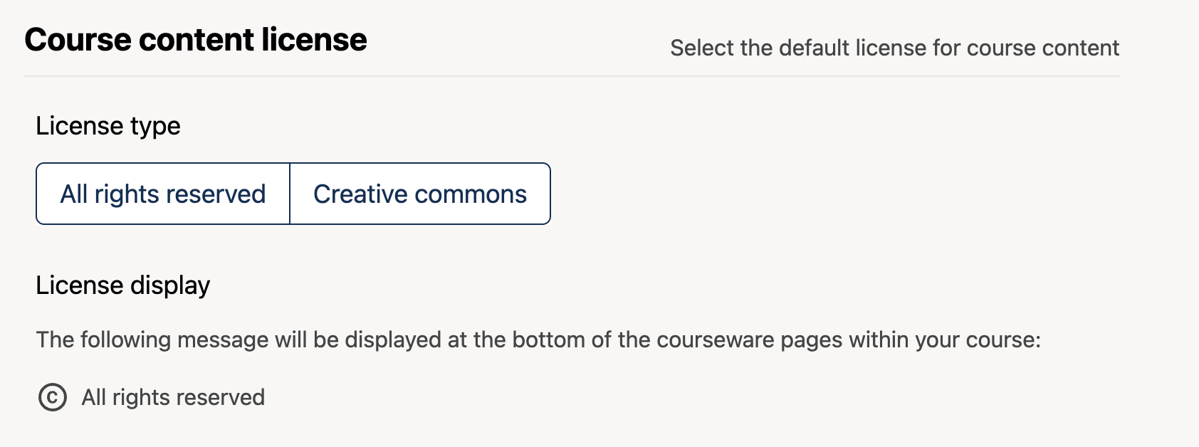 The license options that you select apply to all course content, including videos, unless you explicitly specify different licensing options for your videos. Learners see the license at the bottom of all pages in the course.