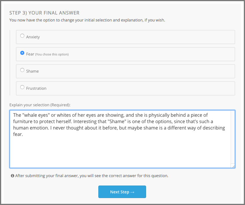 This step is optional. You can submit a final response that is the same as your initial response, or change it completely. When you select Next Step, you learn the correct answer.
